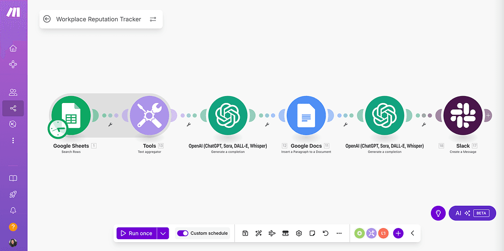 Using Make.com, OpenAI and Google docs, the workflow: